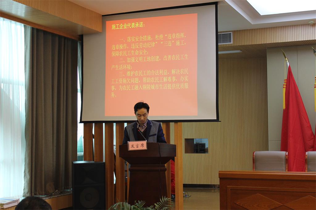 關(guān)愛農(nóng)民工源于內(nèi)心、貴在堅(jiān)持?;顒?dòng)現(xiàn)場,安徽國泰建筑有限公司杜軍云代表作出了關(guān)愛農(nóng)民工的莊嚴(yán)承諾,農(nóng)民工代表承諾將立足本職工作,苦練技能,為建設(shè)銅陵文明之城增光添彩。