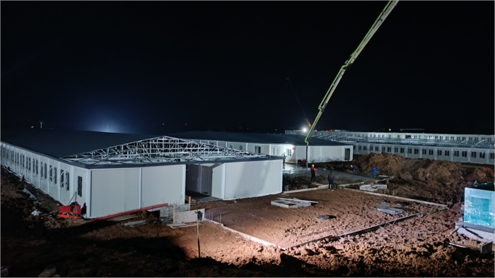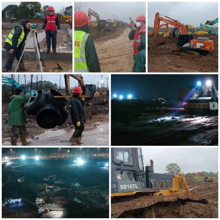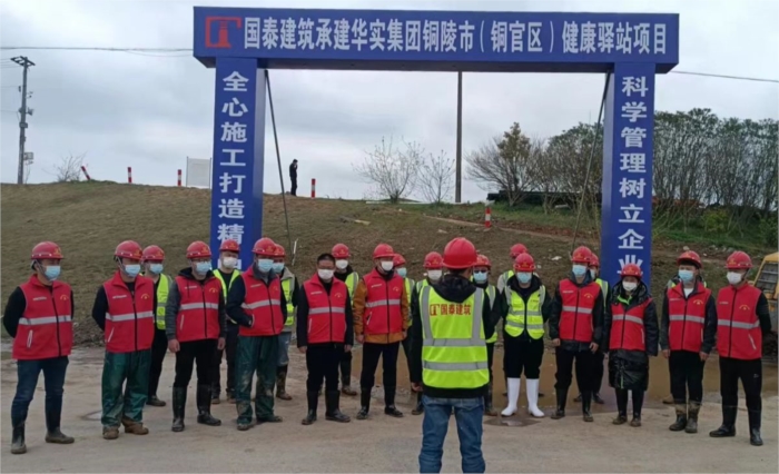 該項(xiàng)目工程量大、功能標(biāo)準(zhǔn)要求高、建設(shè)工期短。疫情就是命令,防控就是責(zé)任,在接到任務(wù)后,國(guó)泰建筑舉集團(tuán)之力,調(diào)集所有精兵強(qiáng)將及施工管理人員18名、后勤保障人員9名,其中中共黨員16名。現(xiàn)場(chǎng)施工總?cè)藬?shù)達(dá)到385名,各分項(xiàng)施工隊(duì)伍11個(gè)。3月15日進(jìn)駐施工現(xiàn)場(chǎng),項(xiàng)目開(kāi)工時(shí),正面對(duì)疫情肆虐,銅陵封城,交通管制情況下,機(jī)械物料、設(shè)備短缺,人員組織困難等諸多的壓力,公司董事長(zhǎng)張自洲親臨現(xiàn)場(chǎng)自掛帥作戰(zhàn)。在工程施工出現(xiàn)困難時(shí),果斷成立“作戰(zhàn)指揮部”和黨員突擊隊(duì),實(shí)行12小時(shí)輪班制,為了將每個(gè)小組的施工節(jié)奏步調(diào)一致,效能發(fā)揮到最大化,堅(jiān)持每天召開(kāi)2次現(xiàn)場(chǎng)協(xié)調(diào)會(huì),統(tǒng)一部署,統(tǒng)一指揮,做好每道工序符合標(biāo)準(zhǔn)流程;在疫情兇猛蔓延,春季寒潮夾雨的情況下,現(xiàn)場(chǎng)400多名工人的后勤安全保障及防疫工作壓力驟增,國(guó)泰建筑沒(méi)有退縮,知難而上,不計(jì)成本,動(dòng)用一切資源和力量,購(gòu)買防凍棉衣、棉被、雨靴、雨衣、消毒水、N95口罩等、并科學(xué)規(guī)劃施工場(chǎng)地防疫工作區(qū)域,合理設(shè)置進(jìn)出口,施工現(xiàn)場(chǎng)和辦公區(qū)域不間段消殺,人員實(shí)名制登記、掃碼(綠碼)進(jìn)場(chǎng),每人每天配發(fā)3只口罩及免酒精擦拭紙,為現(xiàn)場(chǎng)施工防疫工作建立起一道筑牢的防火墻。