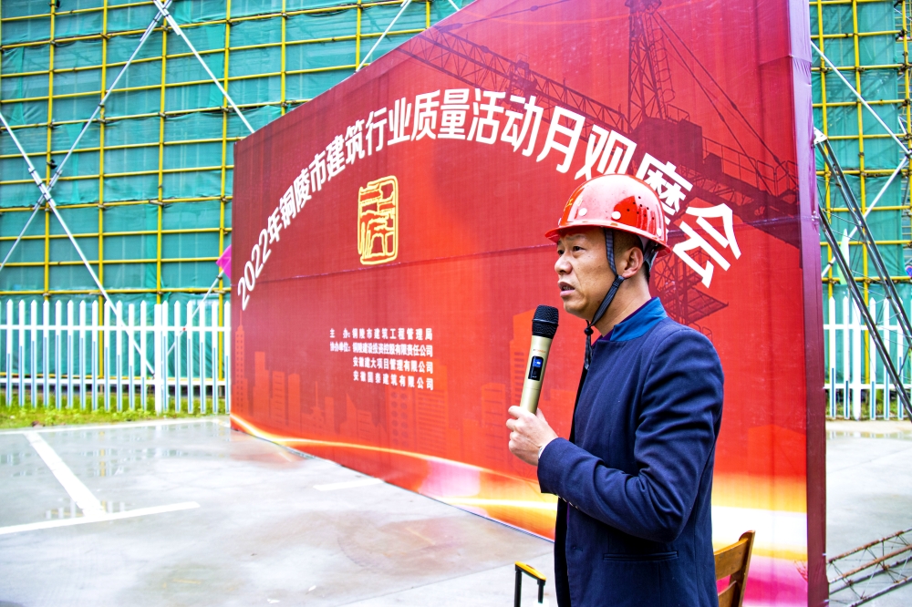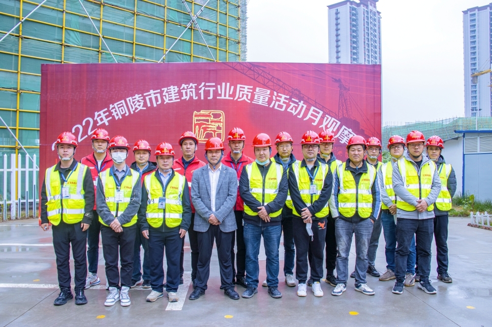 2022年11月24日上午,作為2022年銅陵市建筑行業(yè)“質(zhì)量月”活動(dòng)的重頭項(xiàng)目,市住建局建工局組織工程建設(shè)、施工、監(jiān)理單位共150多人,現(xiàn)場(chǎng)觀摩我司承建的潤(rùn)澤花園二期三標(biāo)項(xiàng)目,交流建筑質(zhì)量管理標(biāo)準(zhǔn)化施工。市住建局質(zhì)檢站副站長(zhǎng)劉大偉、副站長(zhǎng)劉印海、銅陵建投工程部部長(zhǎng)賈代來等領(lǐng)導(dǎo)參與活動(dòng)。國(guó)泰建筑副總經(jīng)理劉東陪同觀摩活動(dòng)。