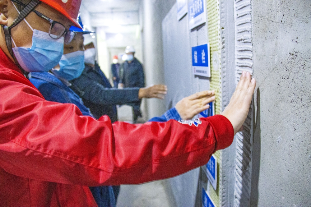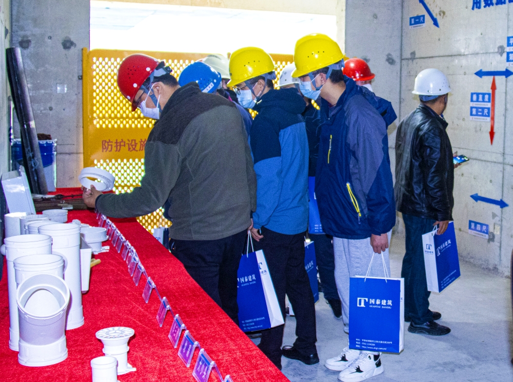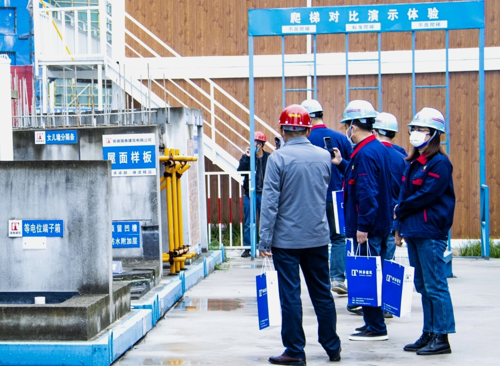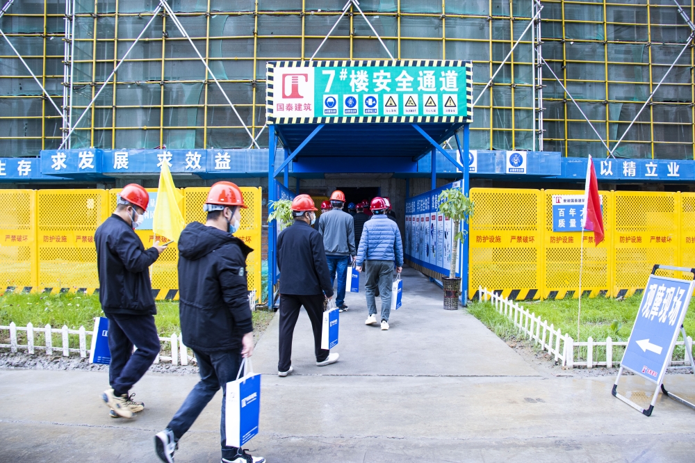在國(guó)泰建筑工作人員的引導(dǎo)下,全體人員參觀了工程質(zhì)量實(shí)體、安全標(biāo)準(zhǔn)化施工、質(zhì)量工藝樣板三個(gè)展示區(qū)和施工現(xiàn)場(chǎng)。
