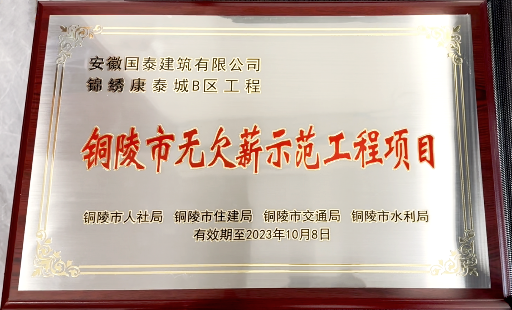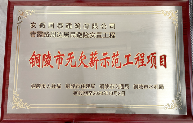 2022年12月14日,由銅陵市人社局、住建局、交通局、水利局聯(lián)合開展的建筑行業(yè)“無欠薪示范工程項(xiàng)目”評選活動揭曉。本次評選銅陵市共有八項(xiàng)工程項(xiàng)目獲獎,其中國泰建筑承建的“錦繡康泰城B區(qū)”和“青霞路周邊居民避險安置工程”兩項(xiàng)工程項(xiàng)目成功獲選為第一批“銅陵市無欠薪誠信示范項(xiàng)目”。