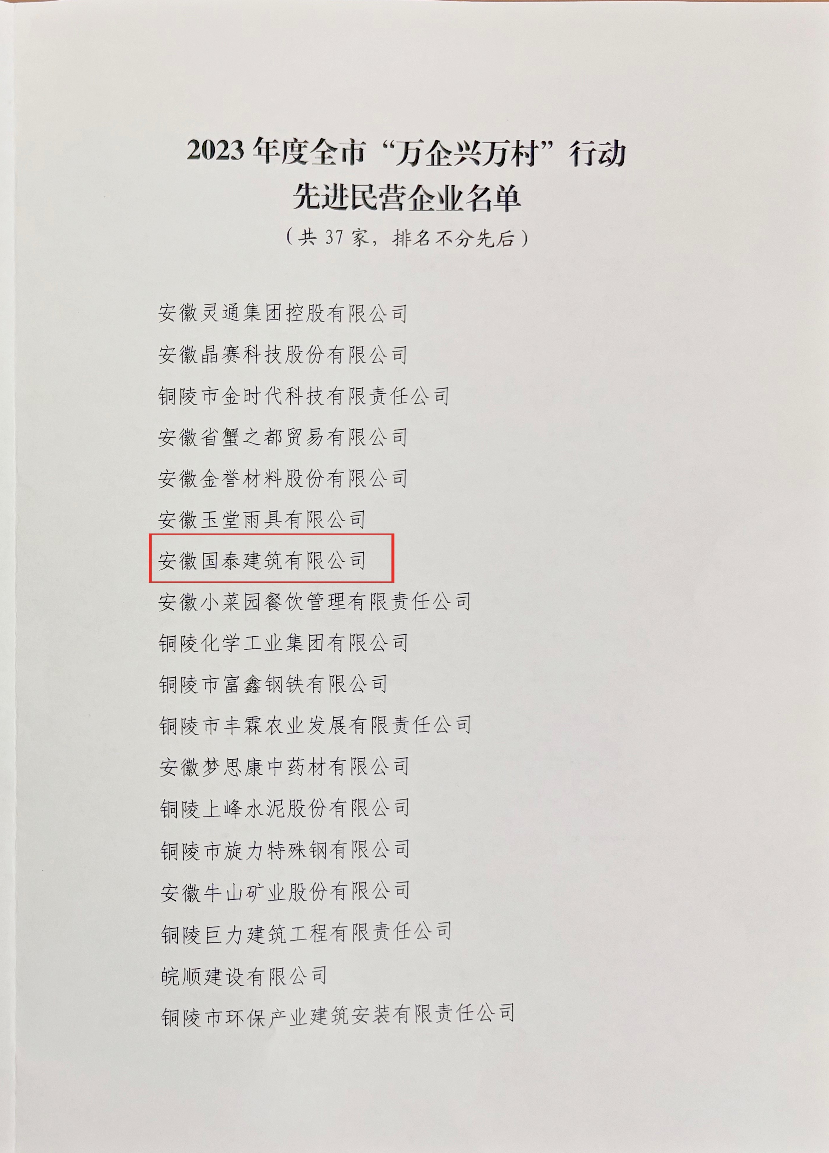 會議上書面?zhèn)鬟_了學(xué)習(xí)習(xí)近平總書記在2023年全國“兩會”有關(guān)“萬企興萬村”行動的重要論述和安徽省“萬企興萬村”行動推進會精神。同時通報表揚了2023年度全市“萬企興萬村”行動先進民營企業(yè)。其中國泰建筑榮獲該項殊榮。公司黨支部副書記張世忠在會中發(fā)表獲獎感言,感謝市委市政府和相關(guān)單位對公司助力鄉(xiāng)村振興工作的肯定。公司將會持續(xù)積極地為推進鄉(xiāng)村建設(shè)貢獻力量。