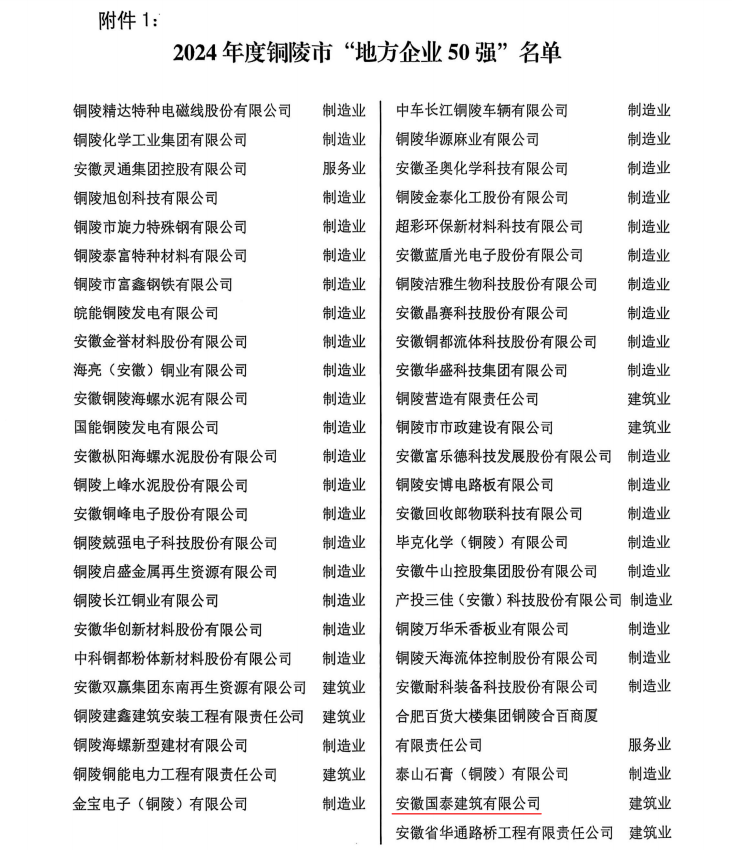 2025年8月8日下午,市企業(yè)聯(lián)合會、市工信局、市稅務(wù)局聯(lián)合舉行2024年度銅陵市地方企業(yè)50強(qiáng)及納稅30強(qiáng)發(fā)布會。市人大、市政府、市政協(xié)、省企業(yè)家聯(lián)合會及市相關(guān)主管局的領(lǐng)導(dǎo)出席會議。會議由“四會”首席輪值會長秦兵主持,市“四會”輪值會長汪華宣布了“2024年度銅陵市地方企業(yè)50強(qiáng)”名單。國泰建筑再次榮進(jìn)2024年度銅陵市“地方企業(yè)50強(qiáng)”。